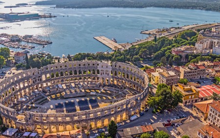 Pula is the economic centre of Istria and is situated in the southern part of the Istrian peninsula. Pula is known above all for its antique monuments, like the Roman amphitheatre, the Augustus temple, the victory gate of the Serge, but also as a great trading centre. The tourist infrastructure is outside of the town centre on the slopes of the peninsula Verudela, partly divided by hundred-year old fir forests. Characteristic of Verudela is the view of the fissured coast, with its islands, bays and beaches full of rocks and gravel. Pula is suited above all for family vacations and to lovers of classical music and interesting concerts are often organised in the amphitheatre. As examples, it is worth mentioning that in 2003 there was a concert by Placido Domingo and in 2004 by Luciano Pavarotti.There are many possibilities for various sport activities.Excursions available: Venice, Plitvice Lakes National Park, Brijuni National Park, canoe safari, jeep safari, “Fish Picnic” boat excursion, Istria tour, visit to the Postojna coves and the Lipizzaner stud farm in Slovenia.