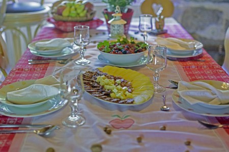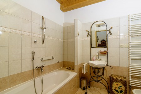 House for 6-9 persons: approx. 225 m² on three floors. In the basement, there is a kitchen with dining area and living room with open fireplace, WC. The ground floor comprises two bedrooms - each with a double and a single bed, and its private bathroom with bathtub. The first floor opens onto a large sun terrace with barbecue fireplace and a covered dining area. The newly furnished attic offers one bedroom with a double and a single bed, air conditioning and a bathroom with Jacuzzi bathtub for two.