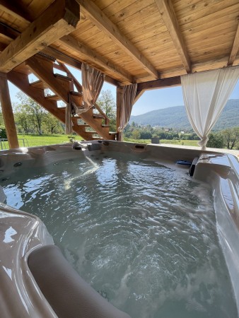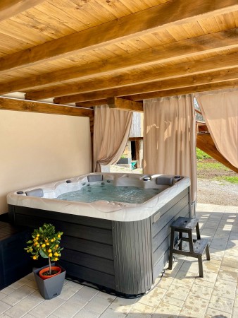 Further details: additional amenities include free Wifi, private parking for 5 cars on the premises. From the basement, you can step onto a covered terrace with a jacuzzi – a perfect place to relax in warm water. Next to it, there is a barbecue area, ideal for enjoying outdoor meals. The ground floor and basement are not connected by an internal staircase but can be accessed separately via an external staircase. In the garden, the sun terrace with sun loungers offers a peaceful spot to unwind while soaking in the beauty of the surrounding nature.