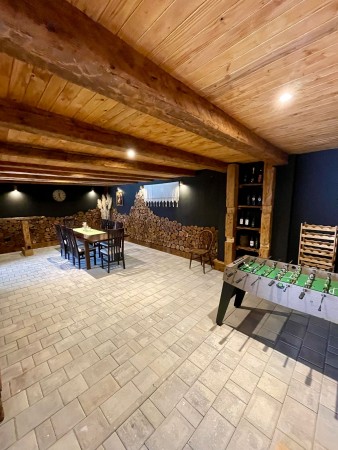 House for 8-10 persons: ca. 200 m², comprising a basement, ground floor and first floor. The basement features a multipurpose room with a fully equipped kitchen, a dining table with chairs, a foosball, and an infrared sauna, as well as a bathroom with a shower. The ground floor includes another fully equipped kitchen with a dining and living area, a pull-out couch (140 x 200 cm), air conditioning and direct access to a spacious terrace (45 m²) with a view of the surrounding greenery. Additionally, the ground floor has one bedroom with a double bed, TV and air conditioning, as well as a bathroom with a shower. A laundry room with a washing machine and dryer is also available. The first floor has two bedrooms, each furnished with one double bed, one single bed, air conditioning and a TV. A bathroom with a bathtub is also located on this floor.