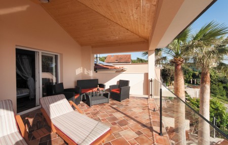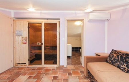 House for 8 persons: approx. 130 m², spread over three floors. The ground floor includes a fully equipped kitchen with dining area, air conditioning and access to the covered sea-view terrace, a cozy living room with a sofa, fireplace, dining table for four, air conditioning and a WC. The first floor has two bedrooms. The first bedroom comprises a double bed, wardrobe, access to the terrace with sea view and a bathroom with bathtub. The second bedroom also offers a double bed, wardrobe and a bathroom with bathtub. The second floor comprises a bedroom with a double bed, wardrobe, access to the terrace with sea view and a bathroom with bathtub. Additionally, there is a fourth bedroom with a pull-out sofa (160 x 200 cm), a bathroom with shower, and a sauna. Each bedroom is equipped with air conditioning and TV.