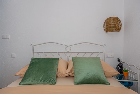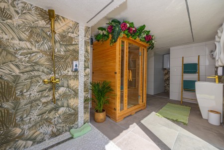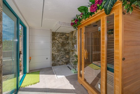 House for 6 persons: approx. 200 m², across three floors. On the ground floor, there is an infrared sauna and a bathroom with a shower. From here, you have direct access to the terrace, where a jacuzzi and a beautiful sea view await. One floor up, there is a kitchen with an adjoining living area and a cozy couch. From here, you can step onto the covered balcony, where a dining area with a table and chairs invites you to enjoy meals outdoors. A barbecue is also available, and the view of the sea makes dining even more special. This floor also includes a bedroom with a double bed and a separate WC with a washing machine. The second floor has two additional bedrooms, both furnished with a double bed. One of the bedrooms has direct access to a balcony with a suspended daybed and a sea view. This balcony can also be accessed from the hallway. The hallway is equipped with an air conditioning unit, ensuring a comfortable temperature throughout the floor. Additionally, there is a bathroom on this level with a shower.