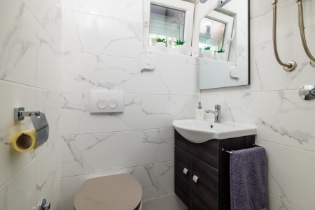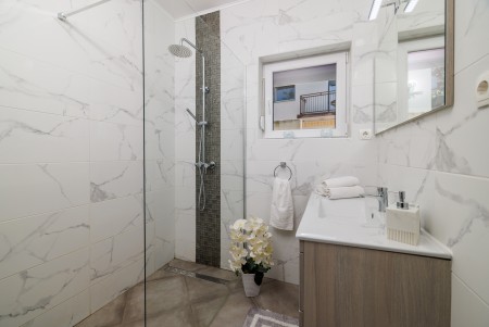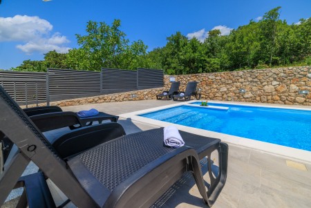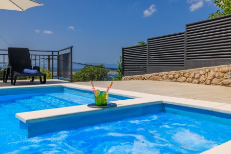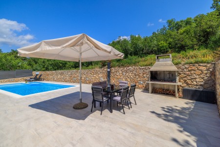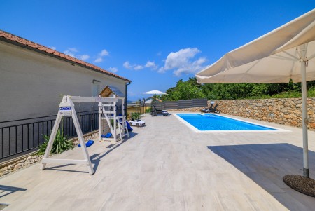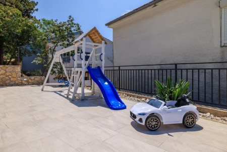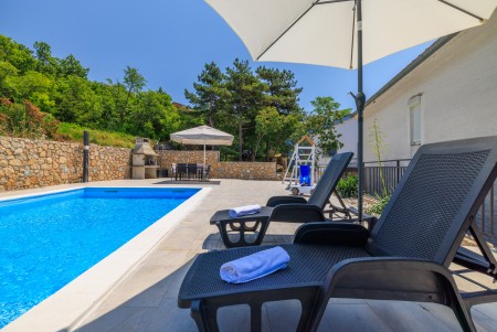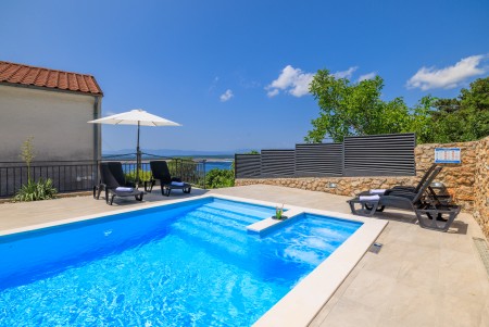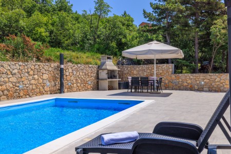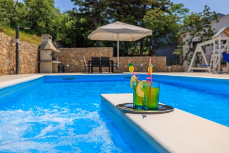 Dramalj is a charming and tranquil seaside resort on the Croatian Adriatic coast, located just a few kilometres from the town of Crikvenica and connected to it by a scenic coastal promenade. Nestled directly by the sea, the village offers a relaxed atmosphere – perfect for couples, families or anyone looking to unwind. Several coves with crystal-clear water, small beaches, and rocky plateaus invite visitors to swim and soak up the sun. Particularly popular is Cape Kačjak, with its nature trail and stunning views of the island of Krk. For those seeking a more active holiday, the surrounding area features well-marked cycling and hiking trails along the coast and into the verdant hinterland. The detached house features two bedrooms and can accommodate up to six guests. Outside, a welcoming terrace awaits with a swimming pool (8 x 4 m), sun loungers, parasols, an outdoor shower, barbecue area, and a small children’s playground with a slide and swing. The nearest grocery store is approximately 1,8 km away and a restaurant can be reached at around 3 km. Additional amenities and shopping opportunities are available in the nearby town of Crikvenica, about 3,2 km away.