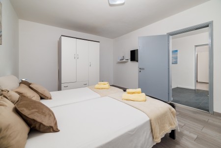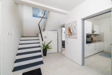 House for 4–6 persons: approx. 120 m², spread over two floors. The first floor comprises a fully equipped kitchen, an air-conditioned living and dining area with a pull-out sofa (140 x 190 cm) for two people, a bathroom with a shower and sink and a separate WC with its own sink. The balcony is accessible via the main entrance. The second floor comprises two bedrooms – one with a double bed and the other one with two single beds. Both bedrooms are equipped with air conditioning and a TV. A shared balcony with sea view is accessible from the hallway on the upper floor. The ground floor of the house is neither rented nor inhabited.
