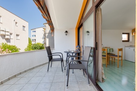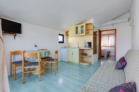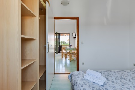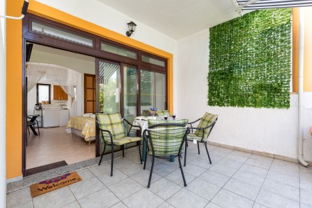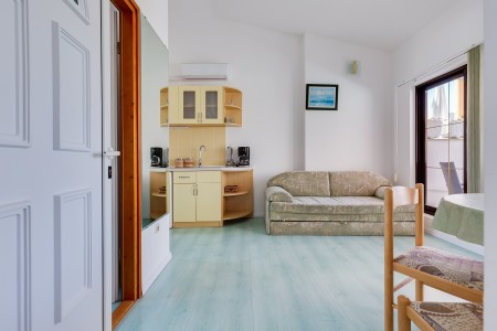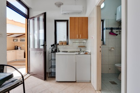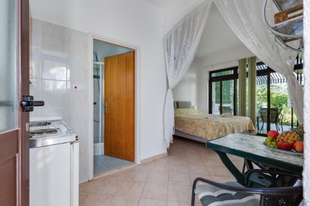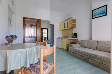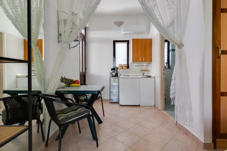 House for 6-8 persons: approx. 120 m², divided into three separate units, rented exclusively as one unit. On the ground floor, there is a studio (approximately 35 m²), consisting of a kitchenette, living/sleeping area with a double bed, TV, air conditioning, a bathroom with a shower, and a terrace. The first floor comprises two units (each approximately 40 m²), each with a bedroom with double bed, a living room with a sofa bed for one person, TV, air conditioning, kitchenette, bathroom with a shower, and a balcony. In the house, there is also another apartment that belongs to the host. However, the host does not live in this apartment during the season.