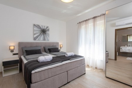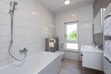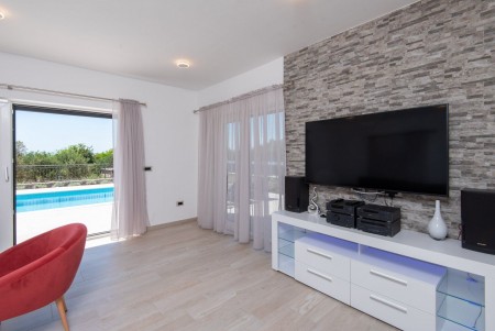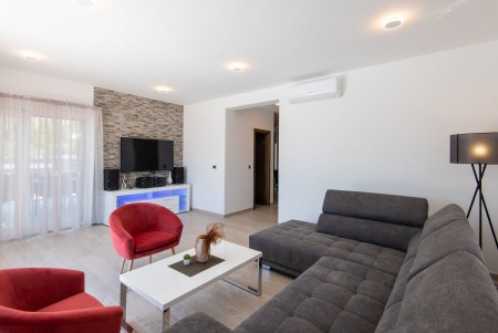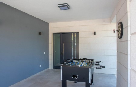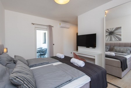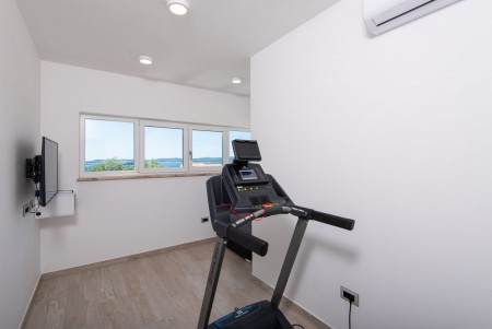 House for 8 persons: approx. 200 m², on two floors, modernly furnished. On the ground floor there is a fully equipped kitchen with dining area and air conditioning, a comfortable living room with air conditioning and access to the large terrace overlooking the pool, a bedroom with a double bed, air conditioning, a TV and an en-suite bathroom with shower, as well as a separate WC. On the first floor, there are three comfortable bedrooms with double beds, each equipped with air conditioning and a TV. One of the bedrooms comprises a spacious balcony with a beautiful sea view, while another has a small balcony. This floor also includes one bathroom with a shower, as well as two additional bathrooms with bathtubs. Additionally, there is a room with fitness equipment, a TV, a PlayStation, and air conditioning.