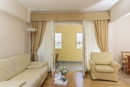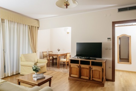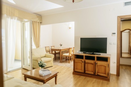 Suite: approx. 59 m², double bed (180 x 200 cm), separate living room with dining area and pull-out sofa with sleeping accommodation for 2 more people (160 x 200 cm), balcony or terrace with sea view